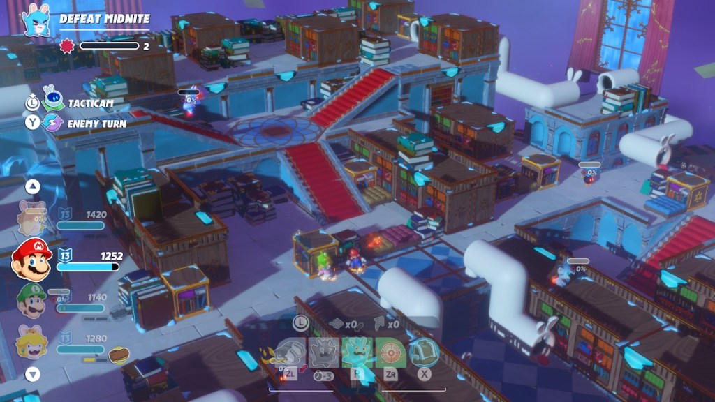 Now, it is worth mentioning that unlike the first game there is a difficulty toggle you get to choose right towards the start of the campaign: Relaxing, Average, or Demanding. I, being confident in my abilities, immediately chose Demanding. And holy smokes I would have thought I chose Relaxing. The ENTIRE game is treacherously easy even on the HIGHEST difficulty. There would be some boss fights that were a big deal to the story, and they were an absolute joke. It did not help that I discovered a combo with Peach’s new ability plus the items mechanic where I can basically grant all my characters immortality every turn. Something like that should have NEVER gotten into the game. Did they even test this with anyone beside elementary students?